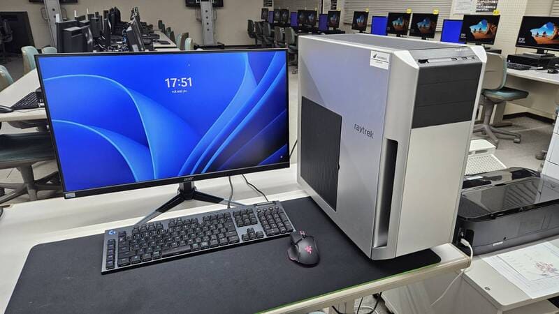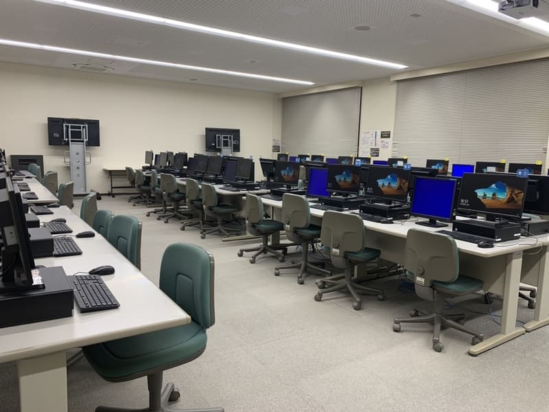 | 中学校の技術や高校の情報の授業はデスクトップPCを整備した情報教室で行います。情報教室は3室、計120台のPCがあり、昼休みや放課後には開放しています。CG制作ができるハイスペックPCも設置しています。 |